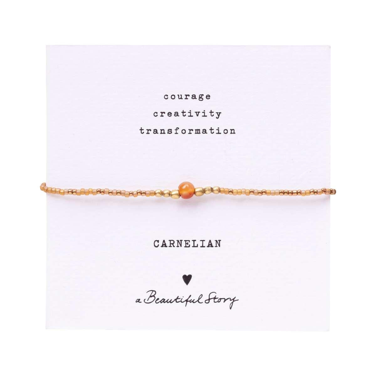 Das elegante Armband Iris Karneol Gold von a Beautiful Story schmiegt sich zart um dein Handgelenk. Aus Glas- und Messingperlen wird das zarte Armband mit einem kleinen Karneol zu einem besonderem Schmuckstück. Der feurige Karneol bringt alles in Bewegung und lässt die Kreativität fließen.